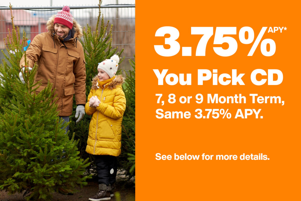 *Annual Percentage Yield (APY) of 3.75% is based off of an interest rate of 3.75% and is effective as of 12/1/25 and subject to change without notice. Unless changes are made to your account during the 10-day grace period following maturity, the Certificate of Deposit (CD) will renew for a 12-month term at the then current rate. The minimum balance on all CDs to obtain the APY is $1,000. Minimum deposit to open the account is $1,000. No maintenance fees. Offer may be withdrawn at any time. A penalty may be imposed for early withdrawal.
